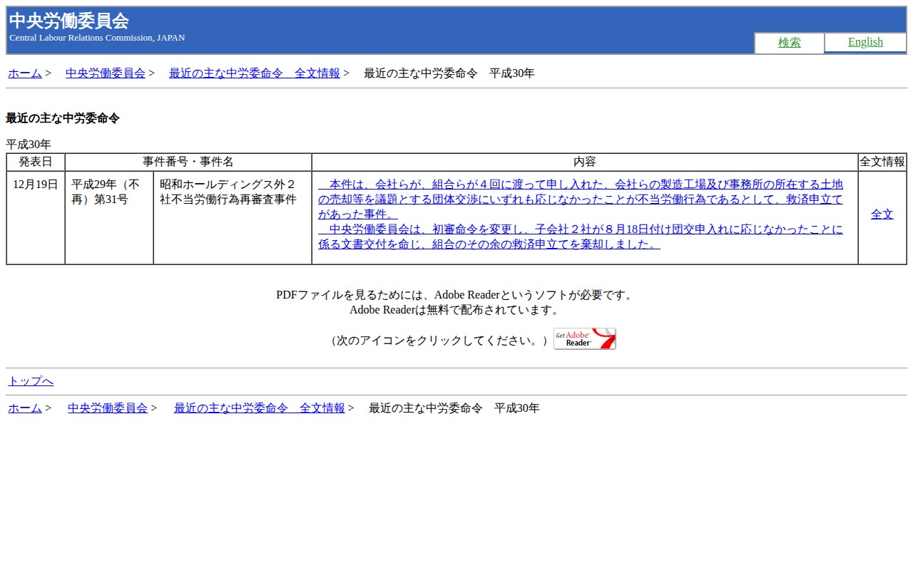 このページは、厚生労働省中央労働委員会の平成30年における主な命令をまとめたものです。12月19日に発表された昭和ホールディングス外2社の不当労働行為再審査事件について掲載されており、組合が4回申し入れた団体交渉に会社が応じなかったことが不当労働行為と判断された事件です。中央労働委員会は初審命令を変更し、子会社2社に対して8月18日付けの団交申入れ応諾の文書交付を命じました。