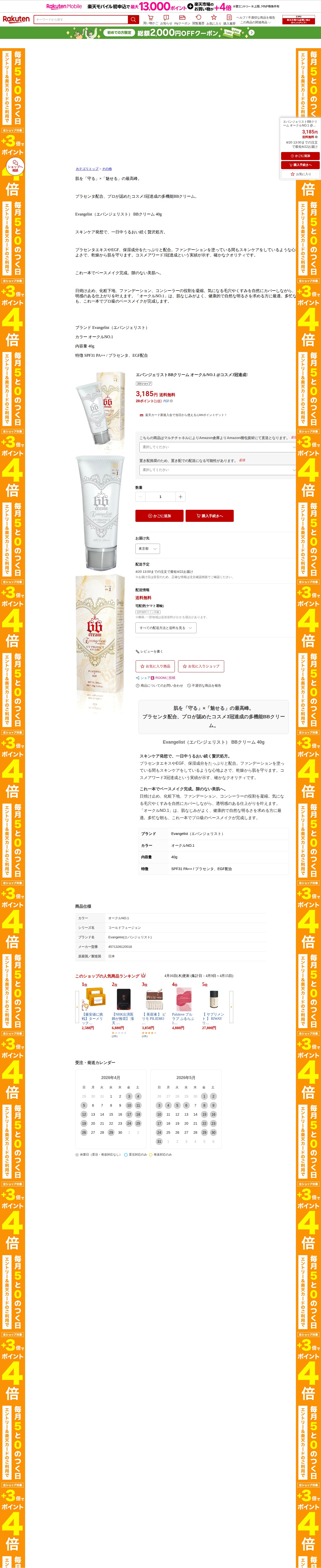 このページはエバンジェリストBBクリーム オークルNO.1の楽天市場での販売ページです。価格は3,185円で送料無料。プラセンタとEGF配合の多機能BBクリームで、@コスメアワード3冠達成。SPF31 PA++の日焼け止め機能を備え、日焼け止め、化粧下地、ファンデーション、コンシーラーの役割を1本で果たします。保湿成分たっぷりでスキンケア効果も期待でき、毛穴やくすみをカバーしながら透明感のある仕上がりを実現。40g入り、日本製です。