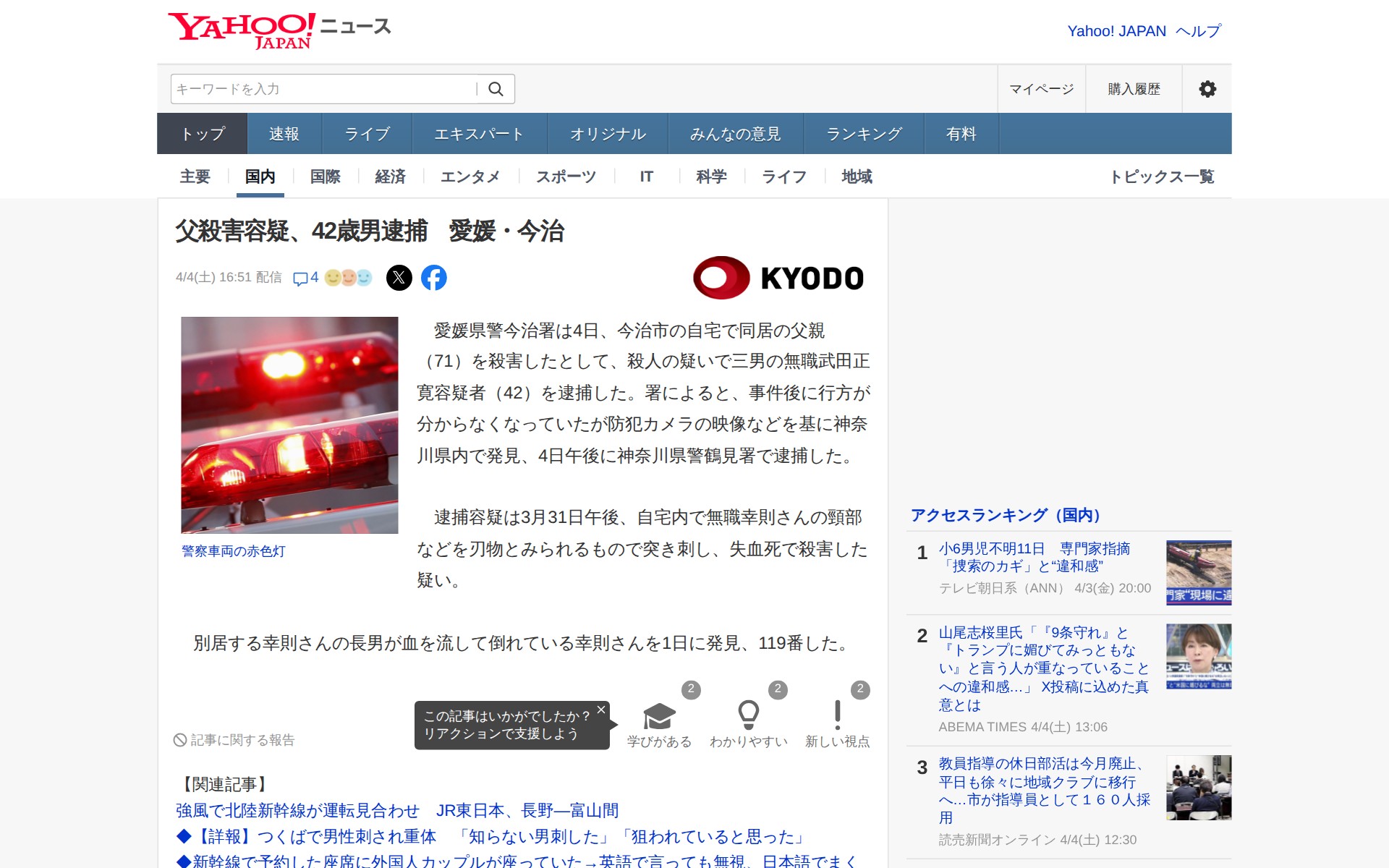 父殺害容疑、42歳男逮捕 愛媛・今治(共同通信) - Yahoo!ニュース - 保存されたスクリーンショット