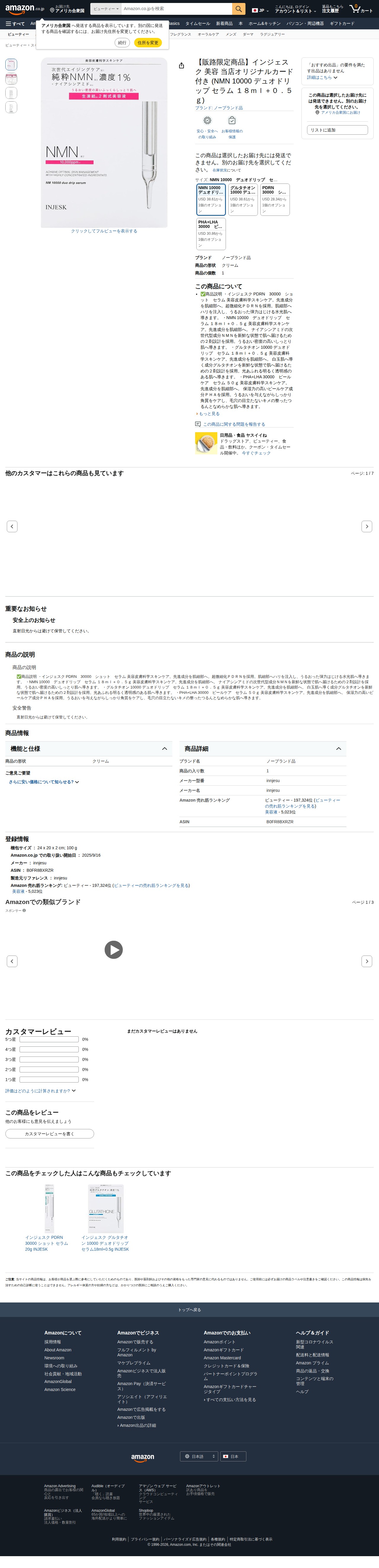 このページは、Amazon.co.jpで販売されている「インジェスク」ブランドの美容液商品の紹介ページです。NMN 10000配合のデュオドリップセラム(18ml+0.5g)など複数の美容皮膚科学スキンケア製品が掲載されています。これらは販路限定商品で、当店オリジナルカード付きです。商品は先進成分を肌細部に届ける設計で、NMN、PDRN、グルタチオン、PHAなど異なる美容成分を含む複数の選択肢が提供されており、肌のハリ、潤い、透明感、毛穴ケアなど様々な効果が謳われています。