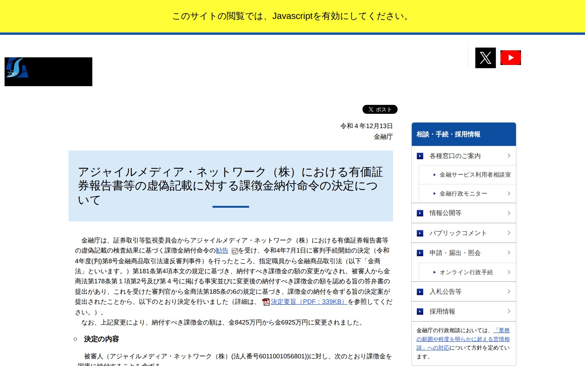 アジャイルメディア・ネットワーク(株)における有価証券報告書等の虚偽記載に対する課徴金納付命令の決定について:金融庁