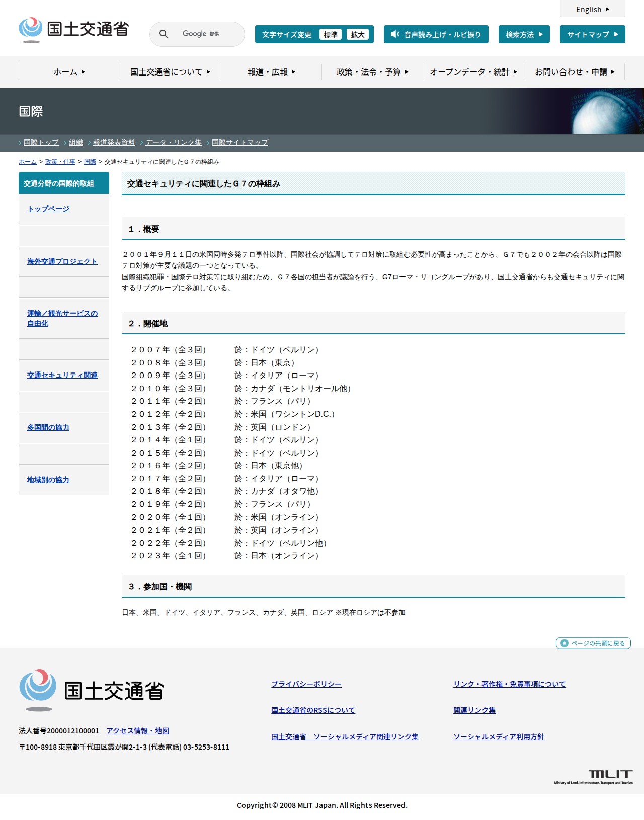 このページは、2001年9月11日の米国同時多発テロ以降、G7が国際テロ対策に取り組む枠組みを説明している。国土交通省を含むG7各国の担当者が交通セキュリティについて議論するG7ローマ・リヨングループの活動を紹介している。2007年から2023年にかけて、ドイツ、日本、イタリア、カナダ、フランス、米国、英国で複数回の会合が開催されている。参加国は日本、米国、ドイツ、イタリア、フランス、カナダ、英国で、ロシアは現在不参加である。