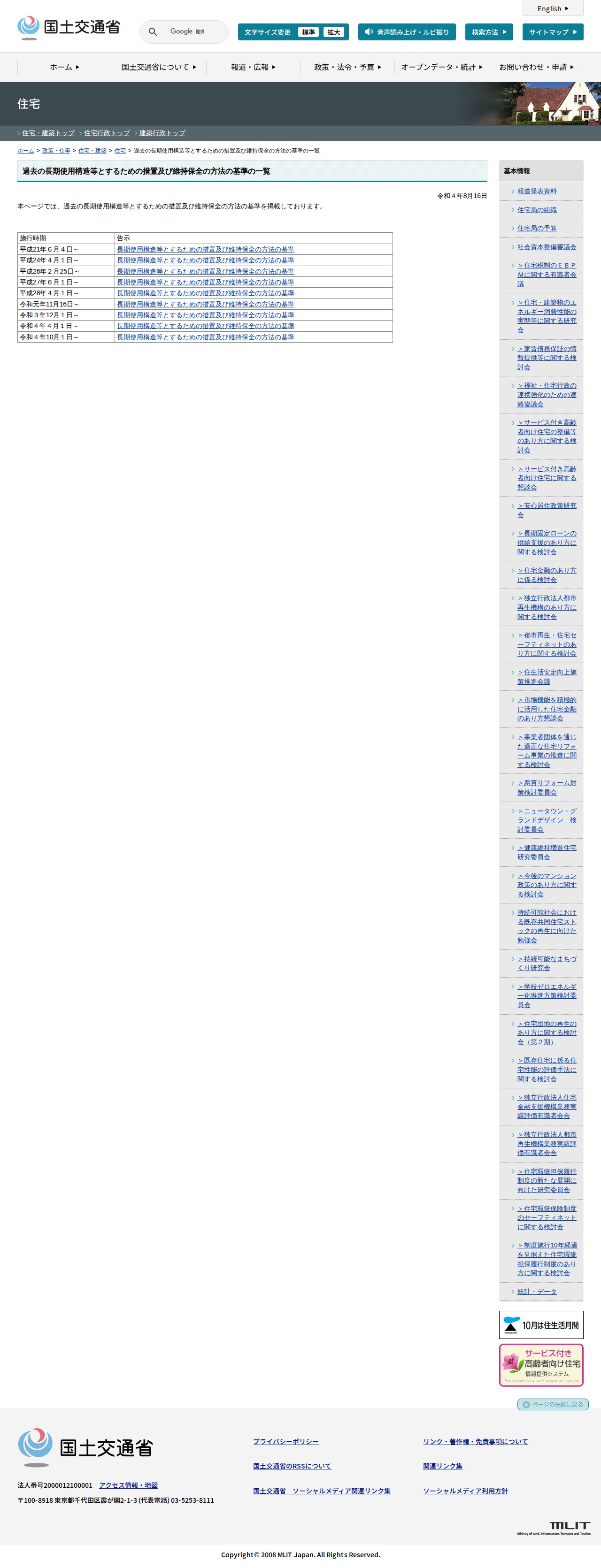 住宅:過去の長期使用構造等とするための措置及び維持保全の方法の基準の一覧 - 国土交通省 - 保存されたスクリーンショット
