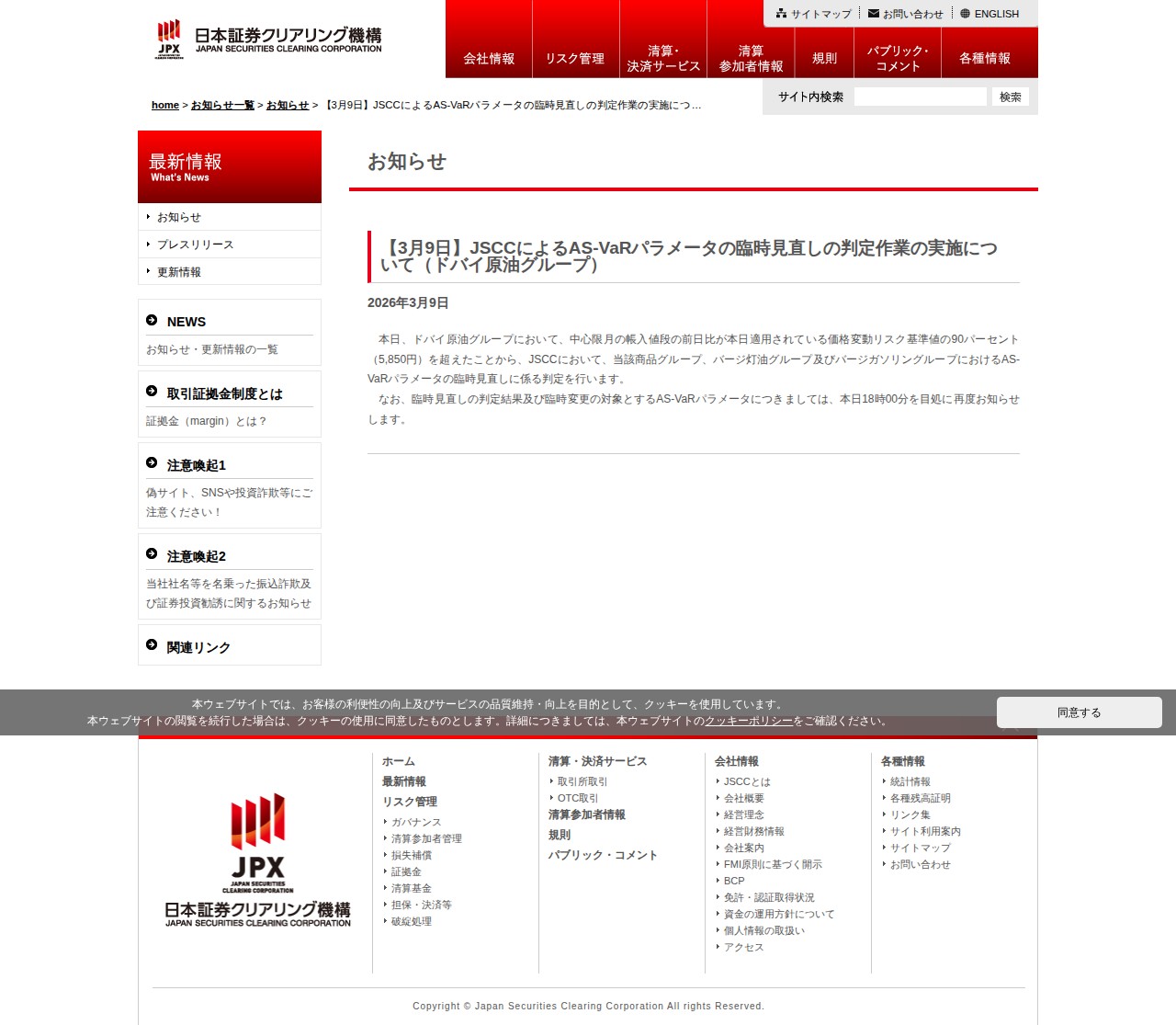 【3月9日】JSCCによるAS-VaRパラメータの臨時見直しの判定作業の実施について(ドバイ原油グループ) | 株式会社日本証券クリアリング機構 - 保存されたスクリーンショット