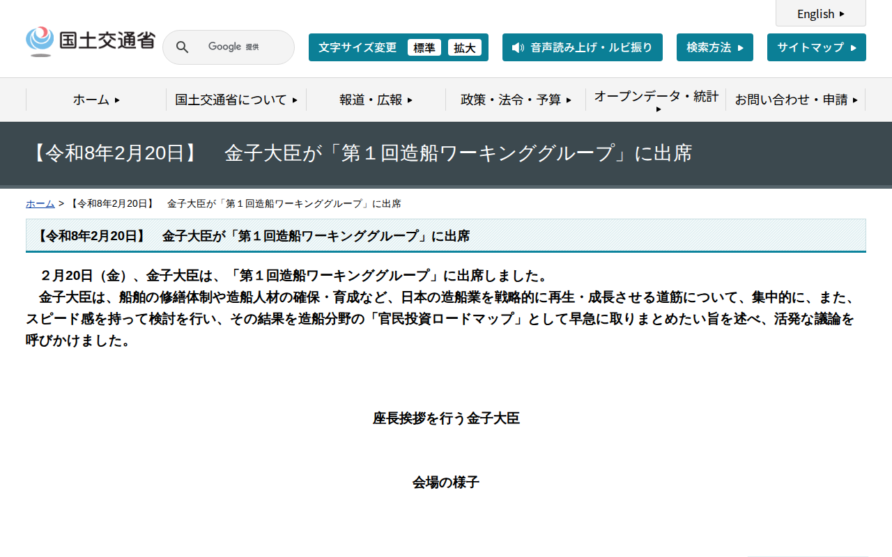 【令和8年2月20日】 金子大臣が「第1回造船ワーキンググループ」に出席 - 国土交通省 - 保存されたスクリーンショット