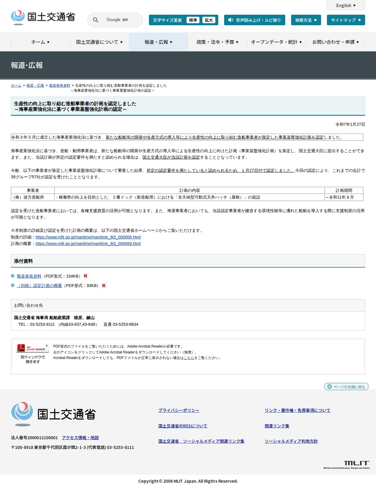 報道発表資料:生産性の向上に取り組む造船事業者の計画を認定しました<br>~海事産業強化法に基づく事業基盤強化計画の認定~ - 国土交通省
