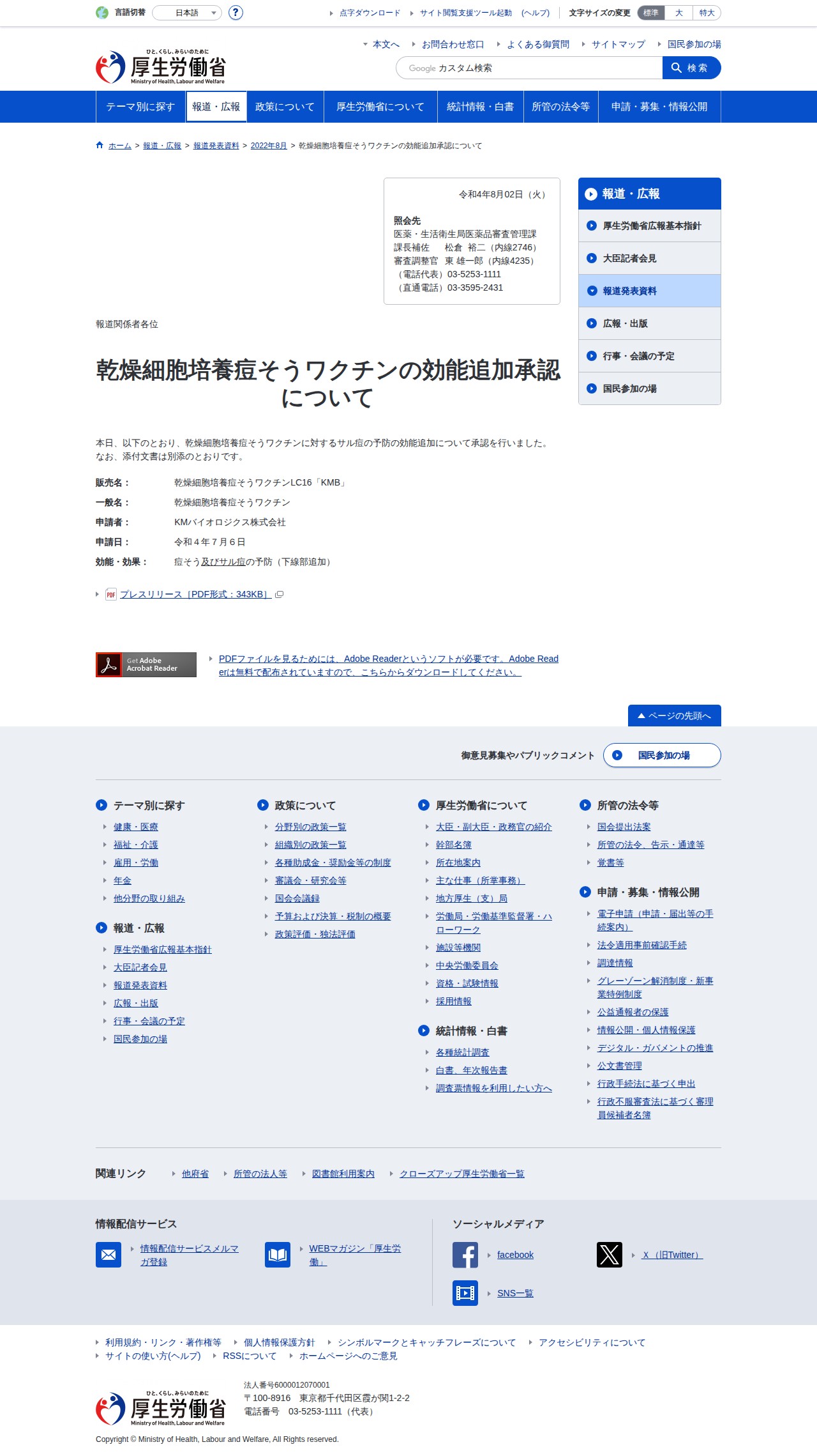このページは、厚生労働省が2022年8月2日に発表した乾燥細胞培養痘そうワクチンの効能追加承認についての報道発表資料です。KMバイオロジクス株式会社が申請した「乾燥細胞培養痘そうワクチンLC16『KMB』」について、従来の痘そう予防に加えてサル痘の予防効能が新たに承認されました。申請は令和4年7月6日になされ、効能・効果は痘そう及びサル痘の予防と変更されています。