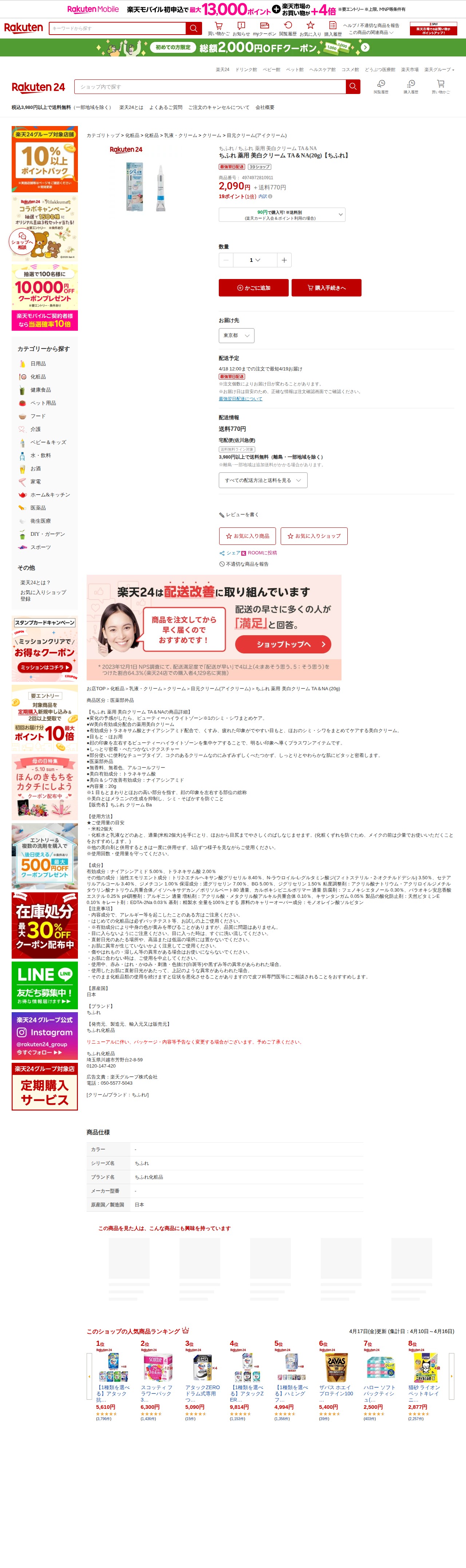 このページは、楽天24で販売されているちふれの薬用美白クリーム TA&NA(20g)の商品ページです。価格は2,090円で、送料は770円(3,980円以上で無料)。トラネキサム酸とナイアシンアミドの2つの美白有効成分を配合し、目元やほおのシミ・シワをまとめてケアします。医薬部外品で、無香料・無着色・アルコールフリー。しっとり密着しながらべたつかないテクスチャーが特徴。チューブタイプで部分使いに便利です。