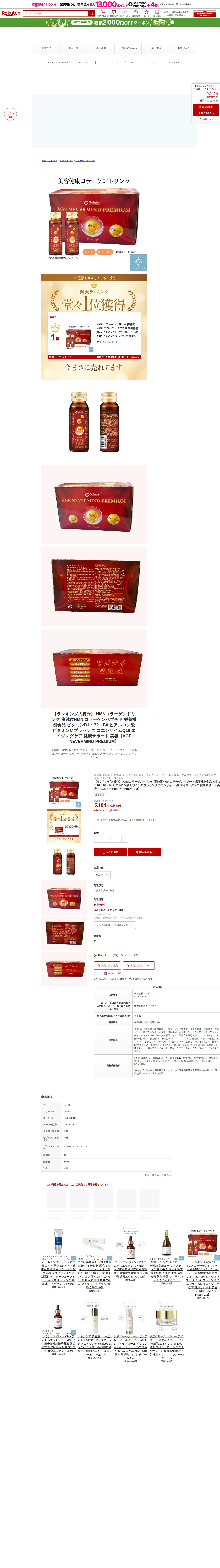 このページは、楽天市場で販売されている「AGE NEVERMIND PREMIUM」というNMNコラーゲンドリンク商品の詳細ページです。高純度NMN、コラーゲンペプチド、ヒアルロン酸、プラセンタ、コエンザイムQ10などを配合した栄養機能食品で、ビタミンB1・B2・B6、ビタミンCなど美容成分が含まれています。価格は5,184円で送料無料、3営業日以内に発送予定です。日本製の液体サプリメントで、1本50mlが10本セット(合計500ml)です。
