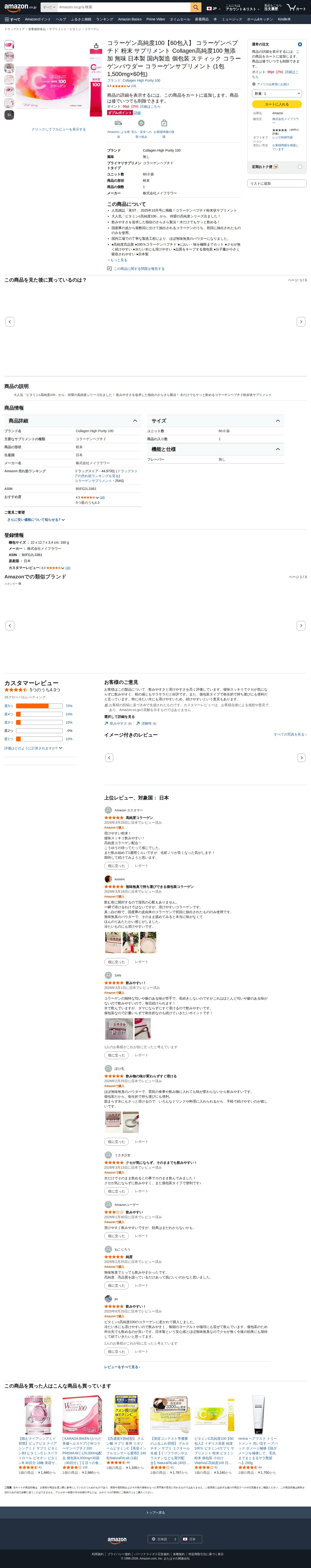 Amazon | コラーゲン高純度100【60包入】 コラーゲンペプチド 粉末 サプリメント Collagen高純度100 無添加 無味 日本製 国内製造 個包装 スティック コラーゲンパウダー コラーゲンサプリメント (1包1,500mg×60包) | Collagen High Purity 100 | コラーゲン - 保存されたスクリーンショット