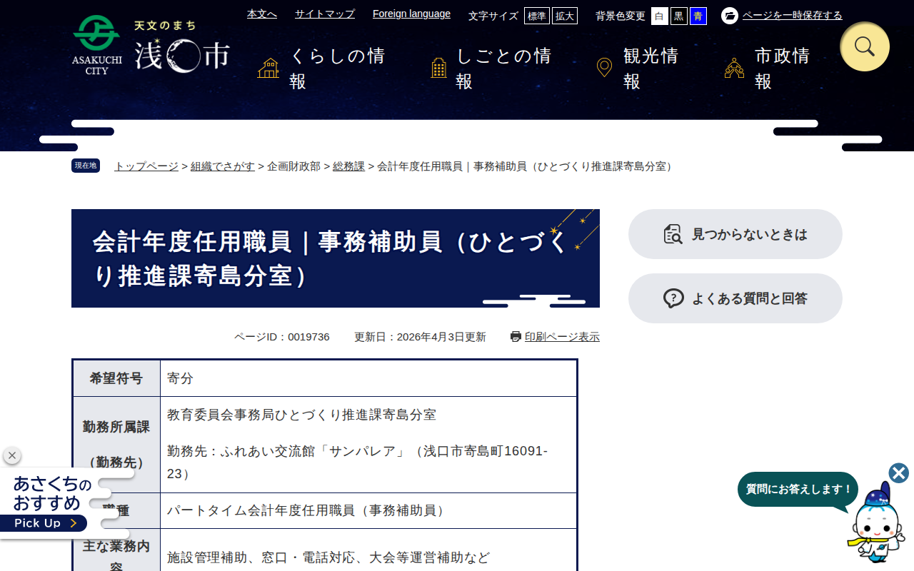 会計年度任用職員|事務補助員(ひとづくり推進課寄島分室) - 浅口市公式ホームページ(総務課) - 保存されたスクリーンショット