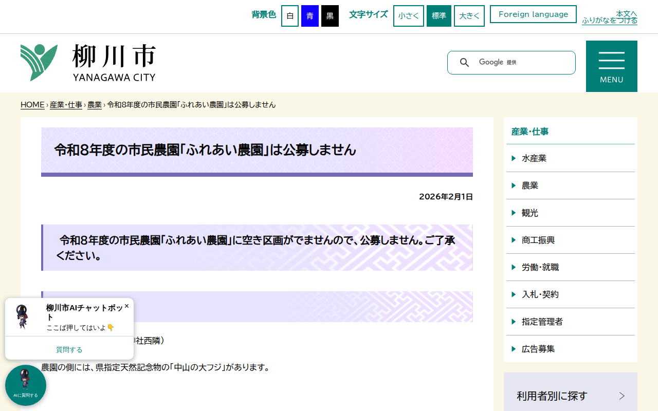 https://www.city.yanagawa.fukuoka.jp/sangyo/nogyo/nogyo_fureainoen.html2026年4月9日 01:21 JST•アーカイブページ・viewer・ダウンロードは、この保存版を基準に表示されます。
