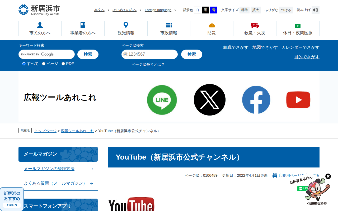 https://www.city.niihama.lg.jp/site/kouhoutool/youtube.html2026年4月9日 05:13 JST•アーカイブページ・viewer・ダウンロードは、この保存版を基準に表示されます。
