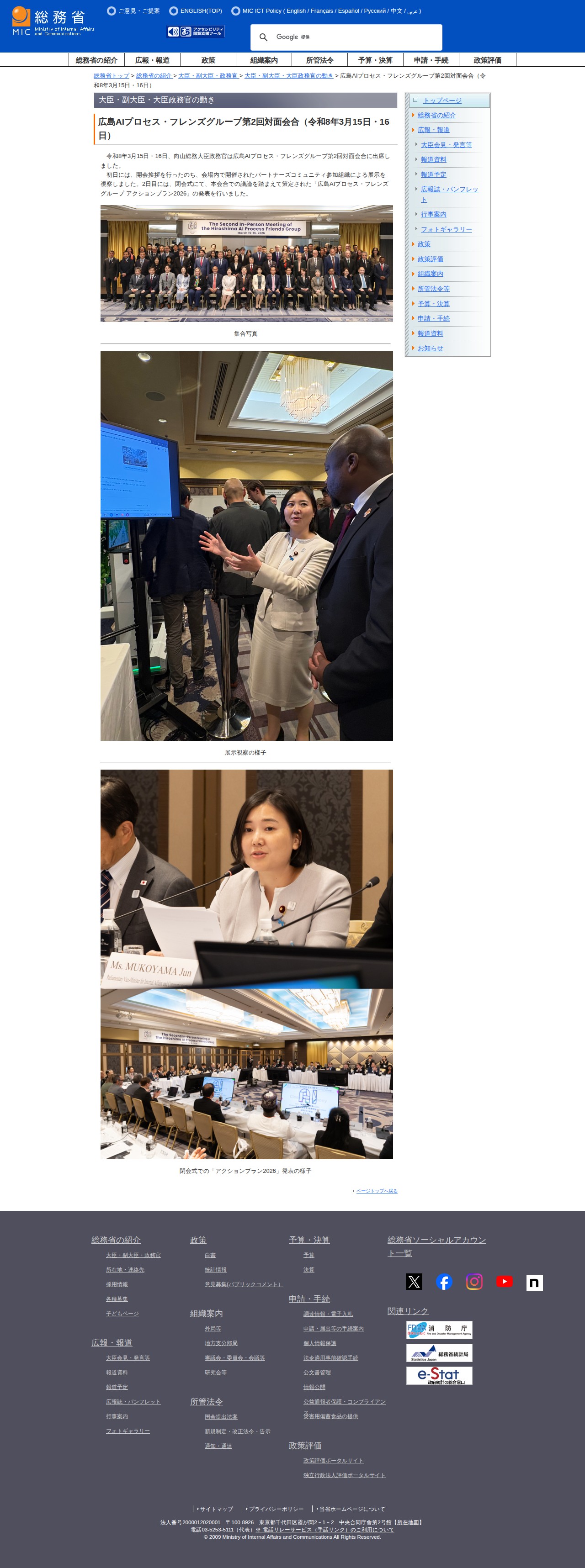 このページは、令和8年3月15日・16日に広島で開催されたAIプロセス・フレンズグループ第2回対面会合についての報告である。向山総務大臣政務官が出席し、初日は開会挨拶とパートナーズコミュニティ参加組織による展示視察を行った。2日目の閉会式では、会合での議論に基づいて策定された「広島AIプロセス・フレンズグループ アクションプラン2026」を発表した。会合の様子は集合写真や展示視察、閉会式の写真により記録されている。