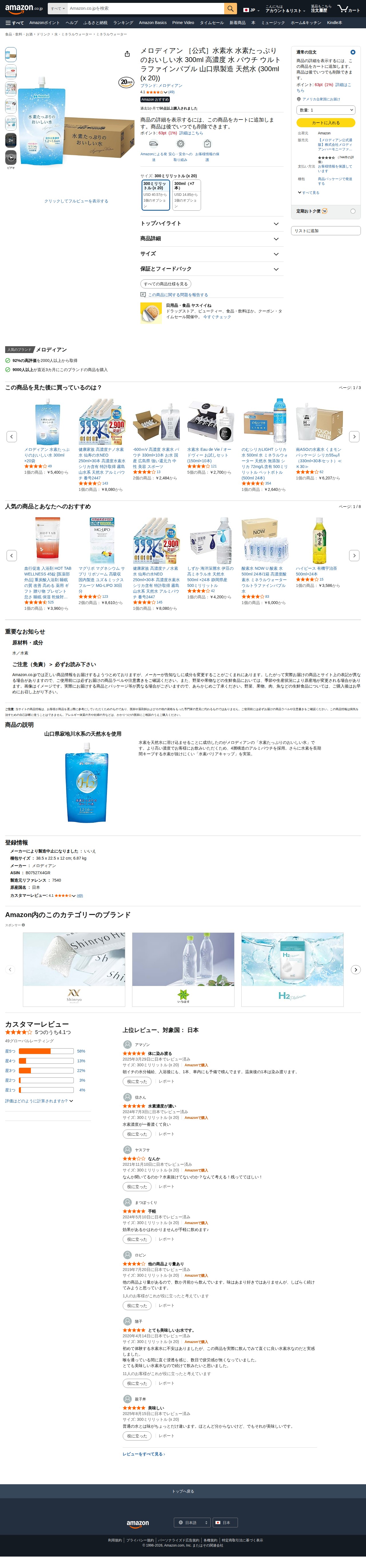 このページはAmazon.co.jpで販売されているメロディアン公式の水素水商品です。300mlパウチ20本セットで、山口県製造の天然水にウルトラファインバブル技術を使用した高濃度水素水です。ブランド評価は4.1つ星で49件のレビューがあり、過去1か月で50点以上購入されています。メロディアンブランドは92%の高評価を2000人以上から獲得しており、信頼性の高い商品です。