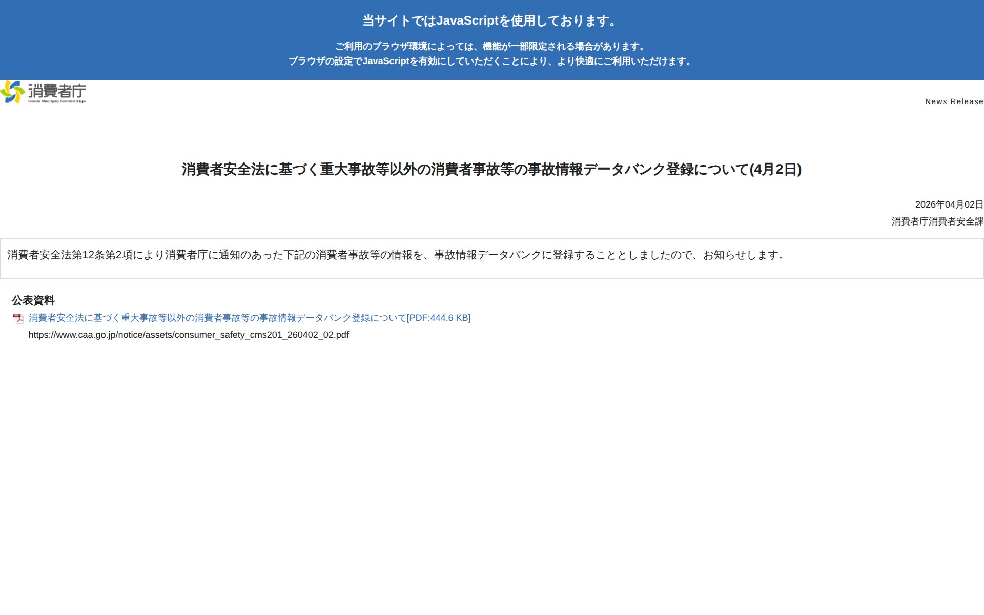 消費者安全法に基づく重大事故等以外の消費者事故等の事故情報データバンク登録について(4月2日) | 消費者庁