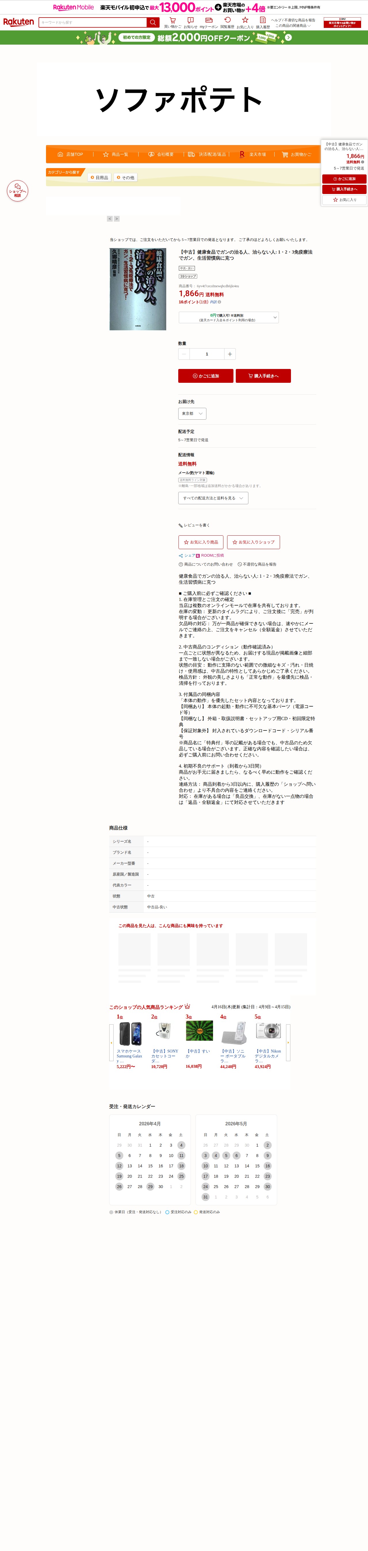 【楽天市場】【中古】健康食品でガンの治る人、治らない人: 1・2・3免疫療法でガン、生活習慣病に克つ:ソファポテト - 保存されたスクリーンショット