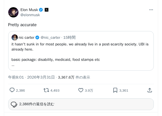 このページは、イーロン・マスクがX(旧Twitter)上で、ニック・カーターのポストに「かなり正確だ」とコメントしたものです。カーターは、現代社会はすでにポスト・スカーシティ(資源が十分にある状態)社会であり、障害給付金、メディケイド、フードスタンプなどの基本パッケージや、在宅でのUBI(ベーシックインカム)が既に存在していると主張しています。マスクがこの見方に同意を示しています。
