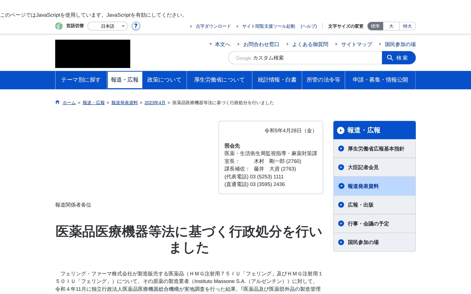 このページは、厚生労働省が令和5年4月28日に公表した医薬品医療機器等法に基づく行政処分に関する発表資料です。フェリング・ファーマ株式会社が製造販売するHMG注射用医薬品について、アルゼンチンの原薬製造業者が医薬品製造管理及び品質管理基準(GMP省令)に適合しないことが確認されました。厚生労働省は同社に対し業務改善命令を発令しました。ただし、これらの製品の有効性・安全性への影響や健康被害の危険性はないと判断され、製品回収は実施されていません。また、健康被害報告もありません。