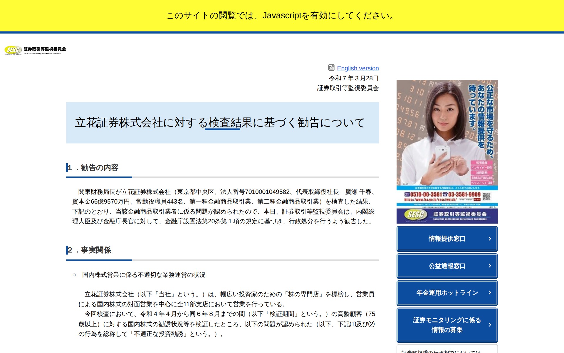 このページは、証券取引等監視委員会が立花証券株式会社に対して行った検査結果に基づく勧告について報告しています。同社は75歳以上の高齢顧客に対し、手数料獲得目的で売却銘柄の損益について虚偽告知や誤解表示を行うなど、不適正な投資勧誘を繰り返していました。また自主規制機関の指摘後も改善せず、同様の不適切行為を続け、顧客に過度な手数料負担をさせていました。加えて内部管理体制が不十分で、営業部門の牽制機能が機能していませんでした。