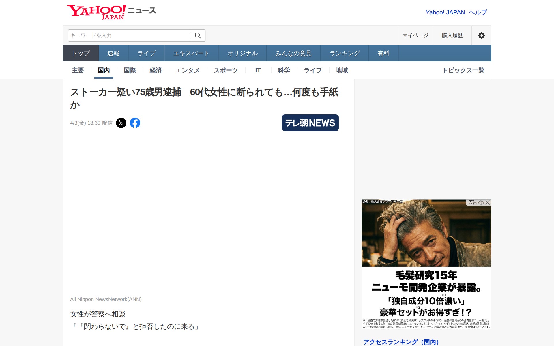 ストーカー疑い75歳男逮捕 60代女性に断られても…何度も手紙か(テレビ朝日系(ANN)) - Yahoo!ニュース - 保存されたスクリーンショット