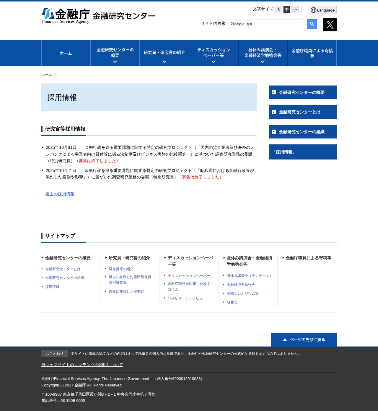 このページは、金融庁の金融研究センターの採用情報を掲載しています。特別研究員として、金融行政に関する特定の研究プロジェクトの調査研究業務委嘱の募集を行っています。2025年には、貸金業者及びノンバンクの比較研究、昭和期の金融行政の役割に関する研究プロジェクトの募集がありましたが、現在は募集終了しています。サイトでは研究員等の紹介、ディスカッションペーパー、講演会情報なども提供しており、掲載論文は執筆者の個人的見解であることを明記しています。