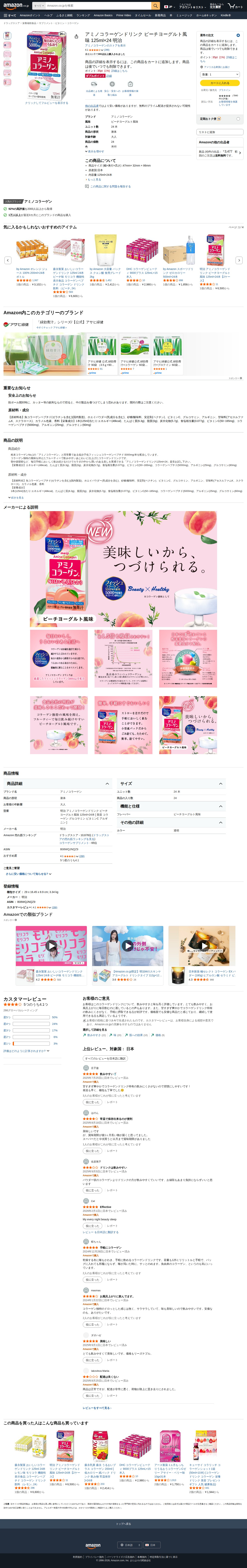 このページは、明治が販売するアミノコラーゲンドリンク ピーチヨーグルト風味 125ml×24本の商品紹介ページです。美容成分としてコラーゲン、グルコサミン、ビタミンC、アルギニンを含む液体タイプのサプリメント飲料で、大人向けの栄養補助食品です。価格は3,477円で、1%のAmazonポイント35ptが付与されます。過去1か月で300点以上の購入実績があり、266件のレビューで平均4.1つ星の評価を獲得しています。出品元はプラスインで、プライム配送対応の商品です。