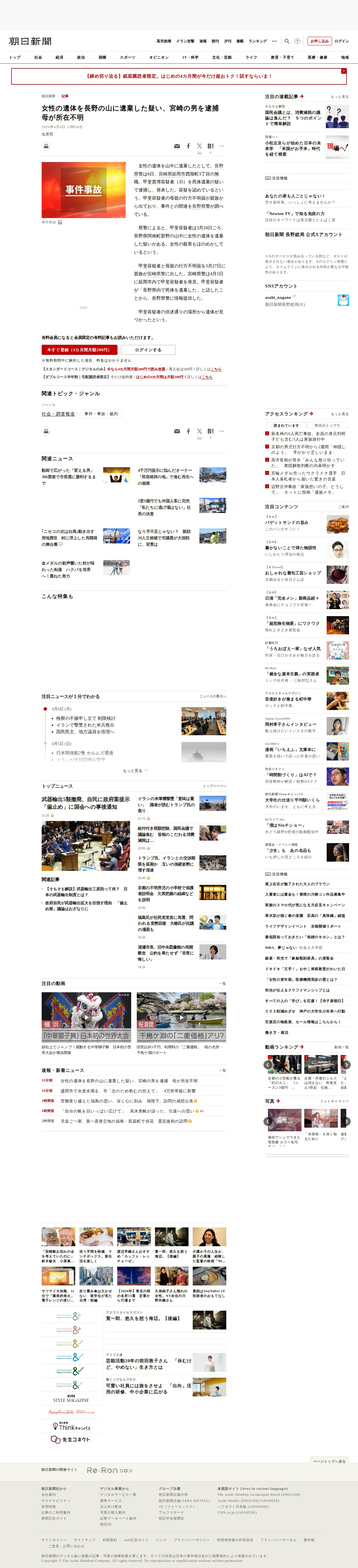 このページは、宮崎県の無職男性・甲斐貴博容疑者(35)が女性の遺体を長野県阿南町の山中に遺棄した疑いで逮捕されたことを報じている。容疑者は3月24日ごろに遺棄し、女性の殺害もほのめかしている。容疑者と母親の行方不明届が3月27日に出されており、長野県警は事件との関連を調査中。容疑者は4月5日に延岡市内で発見され、自らの供述通りの場所から遺体が見つかったという。