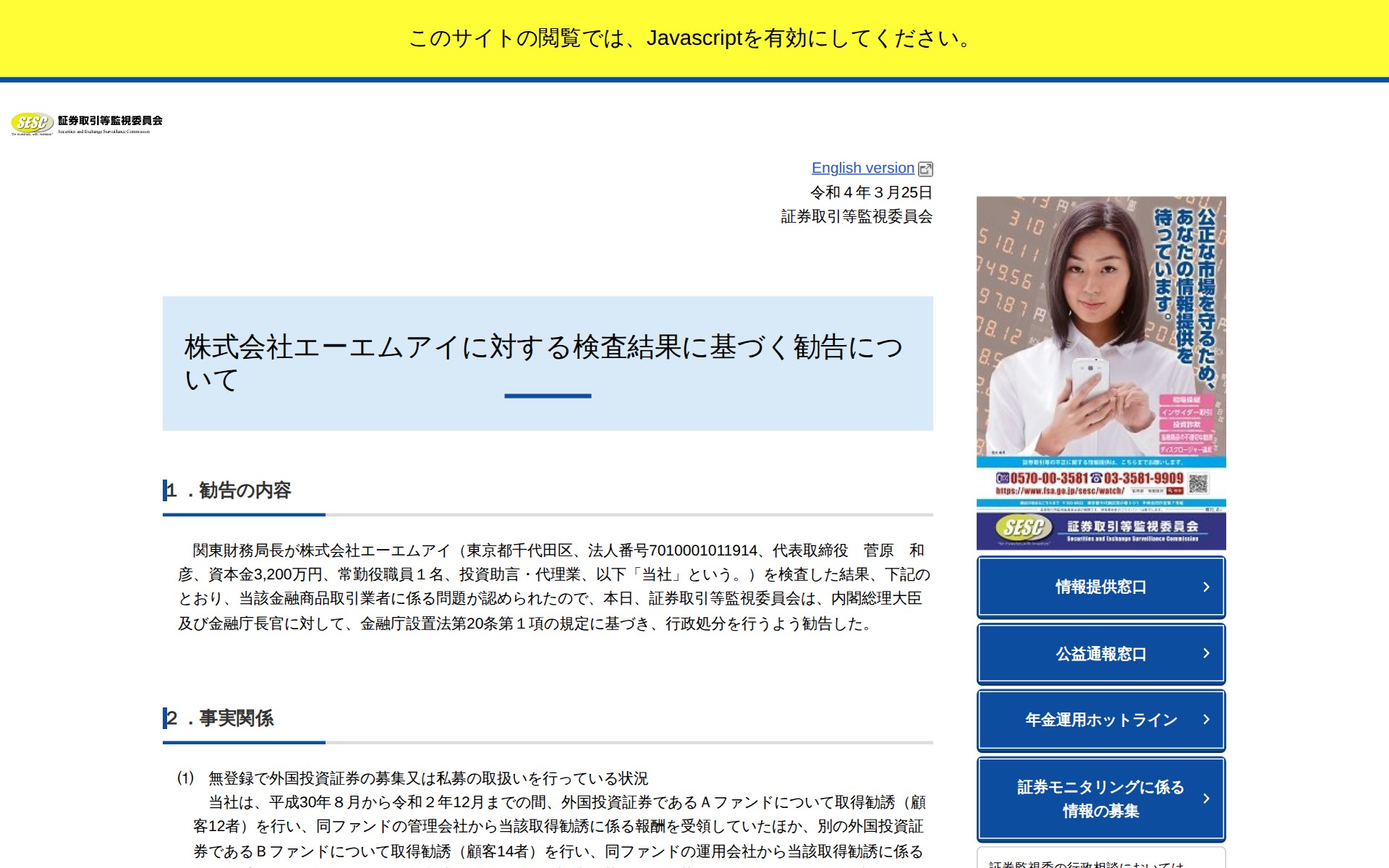 株式会社エーエムアイに対する検査結果に基づく勧告について:証券取引等監視委員会 - 保存されたスクリーンショット