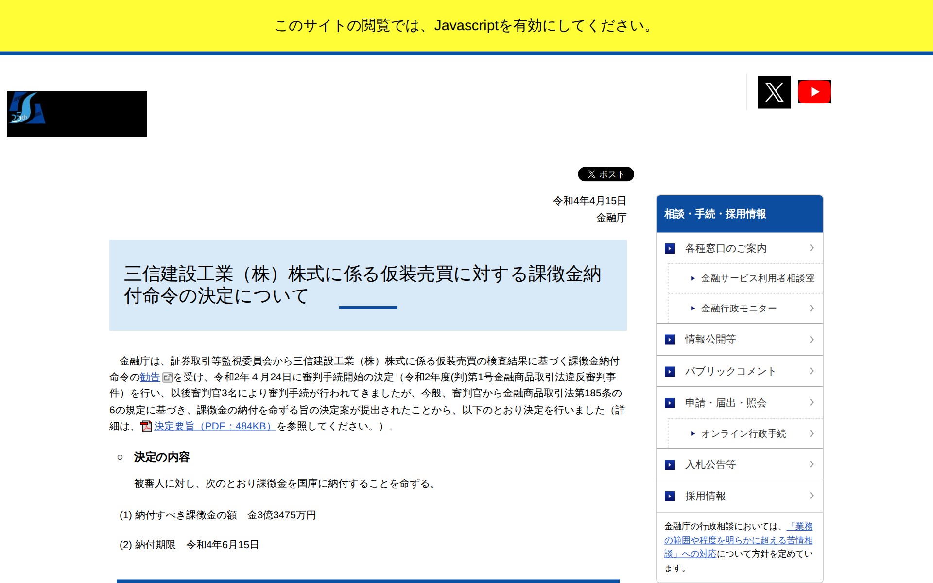 三信建設工業(株)株式に係る仮装売買に対する課徴金納付命令の決定について:金融庁