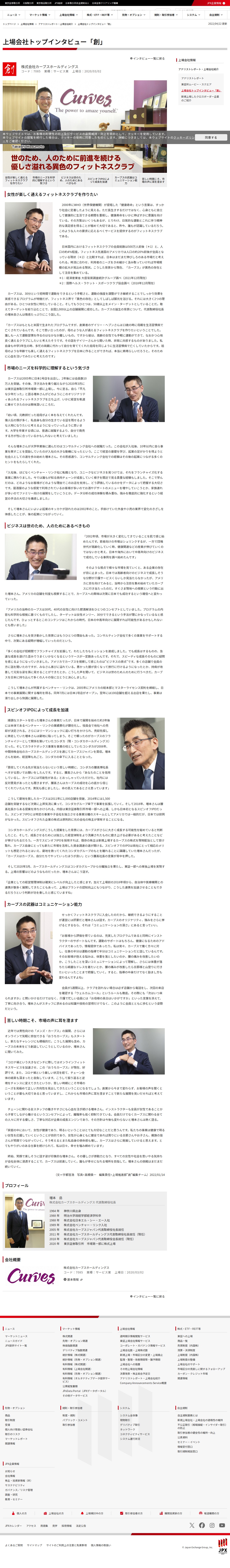 このページは、日本取引所グループの上場会社トップインタビュー「創」シリーズで、株式会社カーブスホールディングス(コード7085)の代表取締役社長・増本岳氏へのインタビュー記事です。カーブスは女性向け・50歳以上をターゲットとした30分間のフィットネスクラブで、創業者が生活習慣病で亡くした母親のため設立されました。日本市場はフィットネス利用率が人口の約4%でアメリカの約20%に対して伸びしろが大きく、科学的なニーズ理解と顧客コミュニケーション能力を武器に全国2000店舗以上を展開し、2020年3月に上場しました。