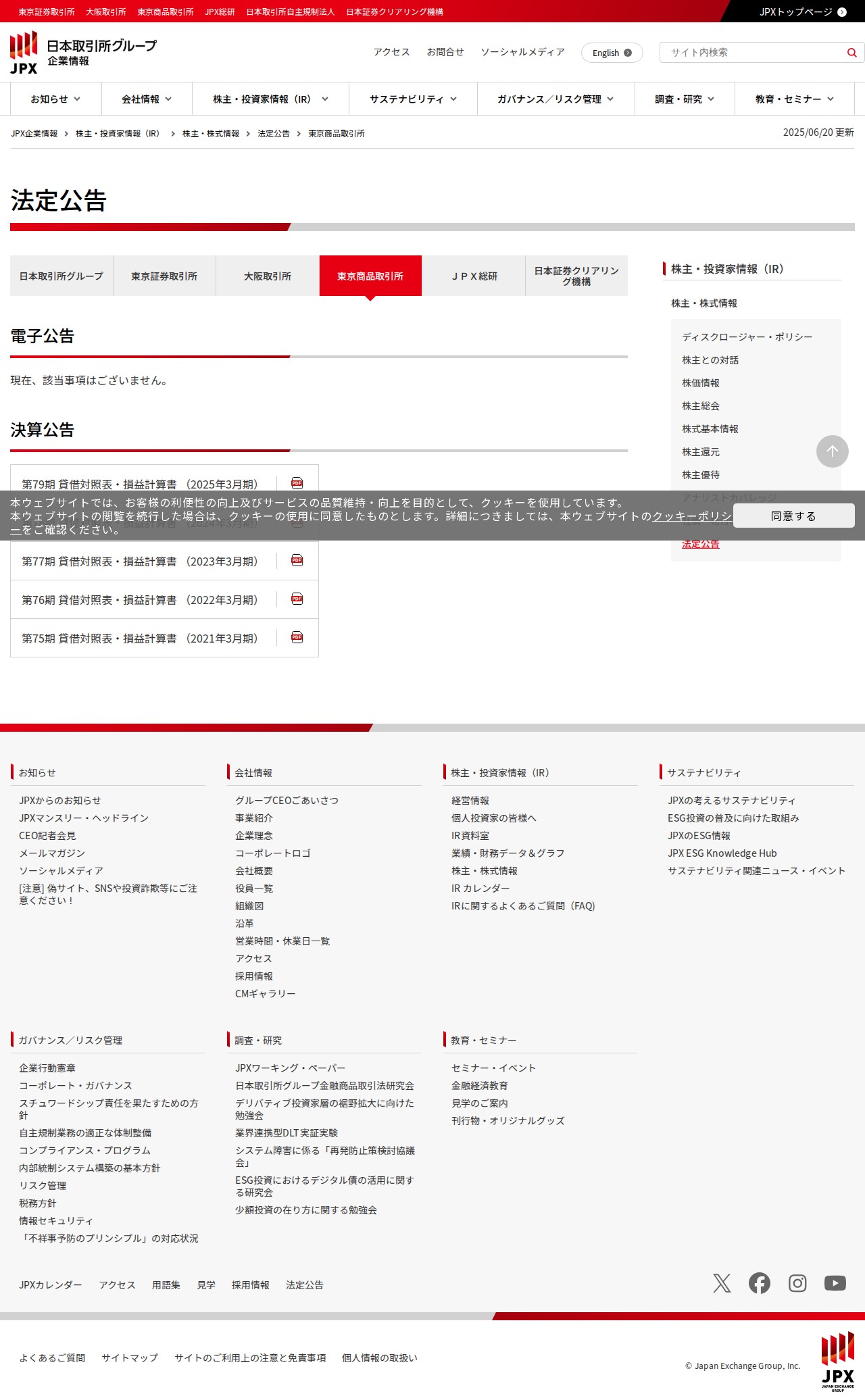 このページは、日本取引所グループの法定公告に関するウェブページです。東京商品取引所の法定公告情報を掲載しており、電子公告に該当する事項は現在ありません。また、決算公告として第75期から第79期までの貸借対照表・損益計算書が掲載されています。ページには株主・投資家情報、ディスクロージャー・ポリシー、会社情報などへのリンクが含まれています。