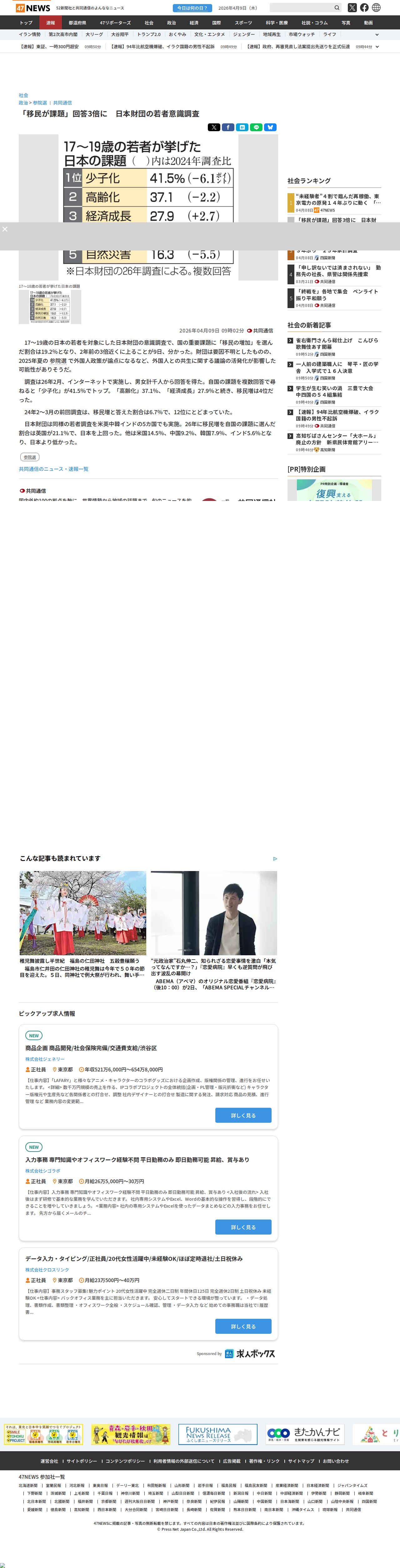 「移民が課題」回答3倍に 日本財団の若者意識調査|47NEWS(よんななニュース) - 保存されたスクリーンショット