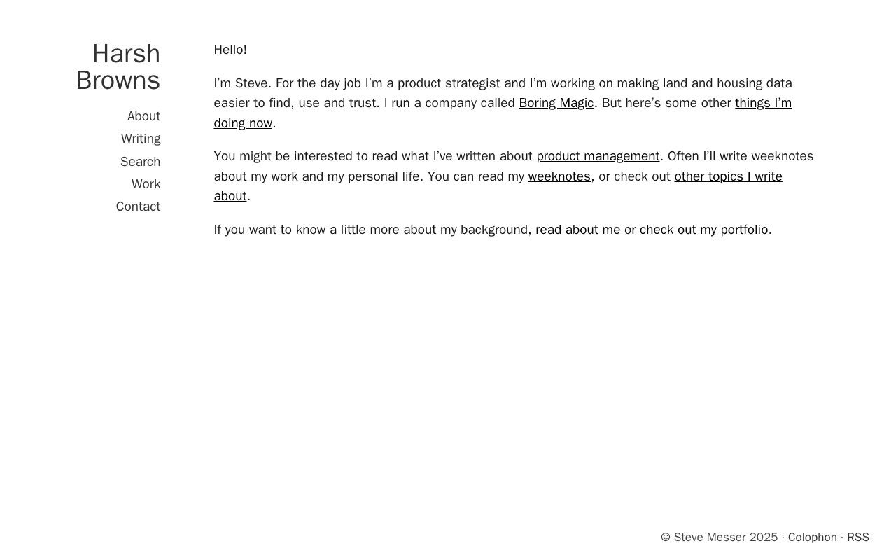 このページはSteve Messerの個人ウェブサイト「Harsh Browns」です。彼はプロダクト戦略家として、土地と住宅データをより使いやすく信頼できるものにする仕事をしており、Boring Magicという企業を運営しています。サイトでは、プロダクト管理に関する記事や週単位の活動記録(weeknotes)を公開しており、訪問者は著者の背景や過去の仕事ポートフォリオについても閲覧できます。