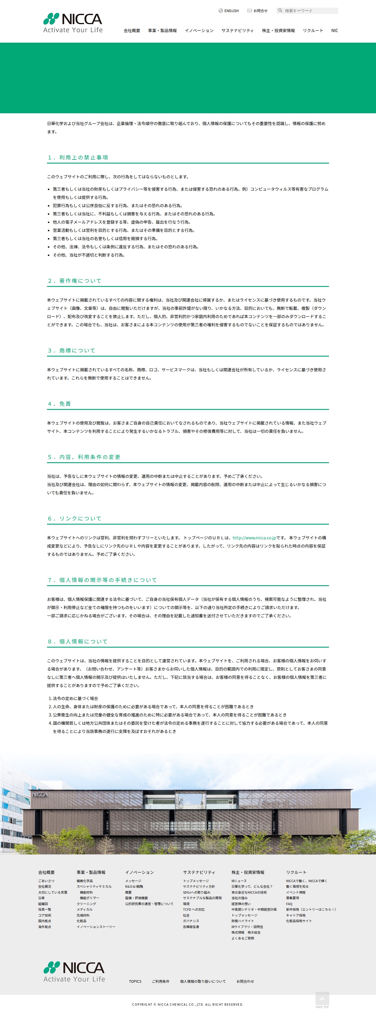 このページは日華化学株式会社のウェブサイト利用条件を説明しています。同社は企業倫理と法令順守、個人情報保護に取り組んでいます。禁止事項として、有害プログラム使用、犯罪行為、虚偽申告、営利目的の営業活動などを挙げています。著作権は同社に帰属し、無断転載や複製は禁止ですが、個人的・非営利・家庭内利用の範囲での部分ダウンロードは可能です。商標やロゴの無断使用も禁止されています。同社は提供情報やウェブサイト利用による損害について責任を負いません。リンクは自由で、個人情報は利用目的範囲内での利用に限定されます。