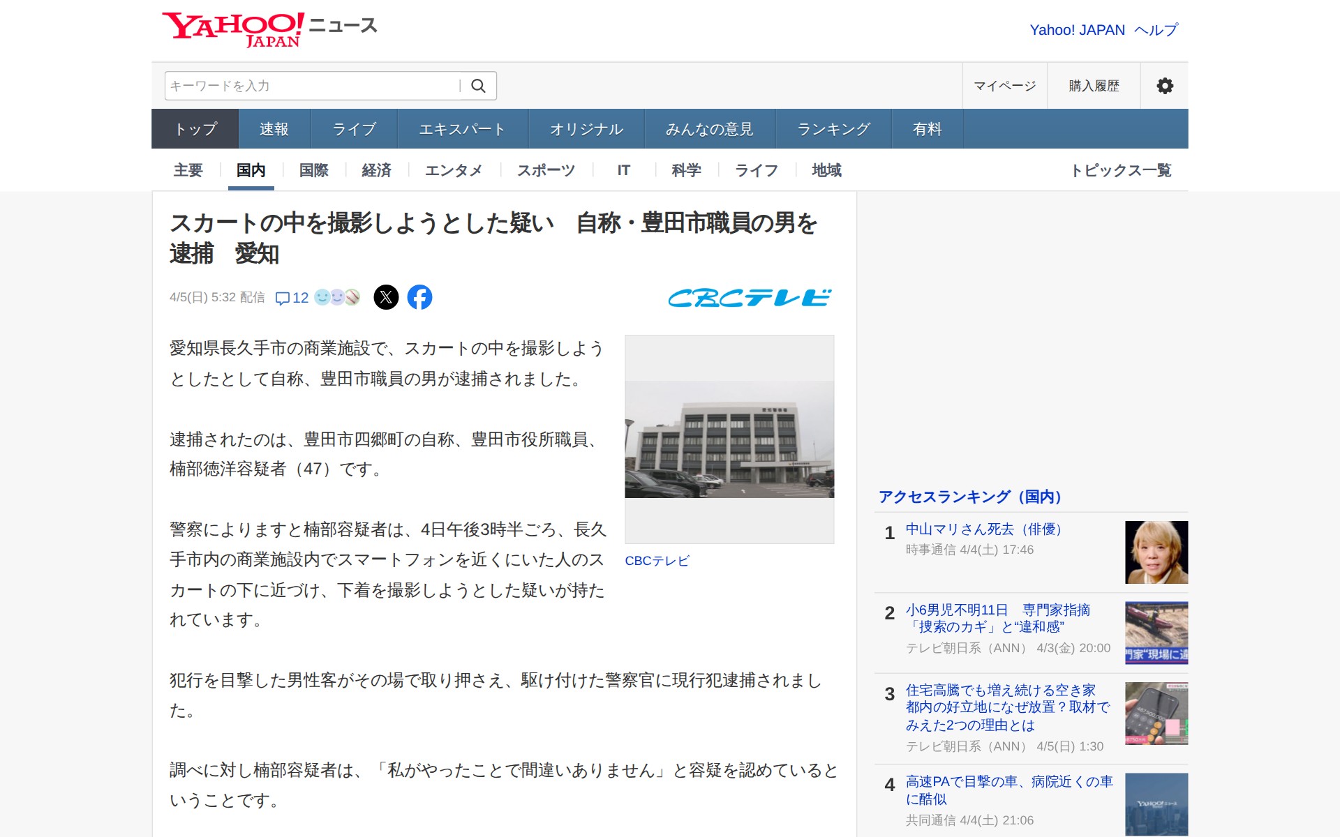 スカートの中を撮影しようとした疑い 自称・豊田市職員の男を逮捕 愛知(CBCテレビ) - Yahoo!ニュース - 保存されたスクリーンショット