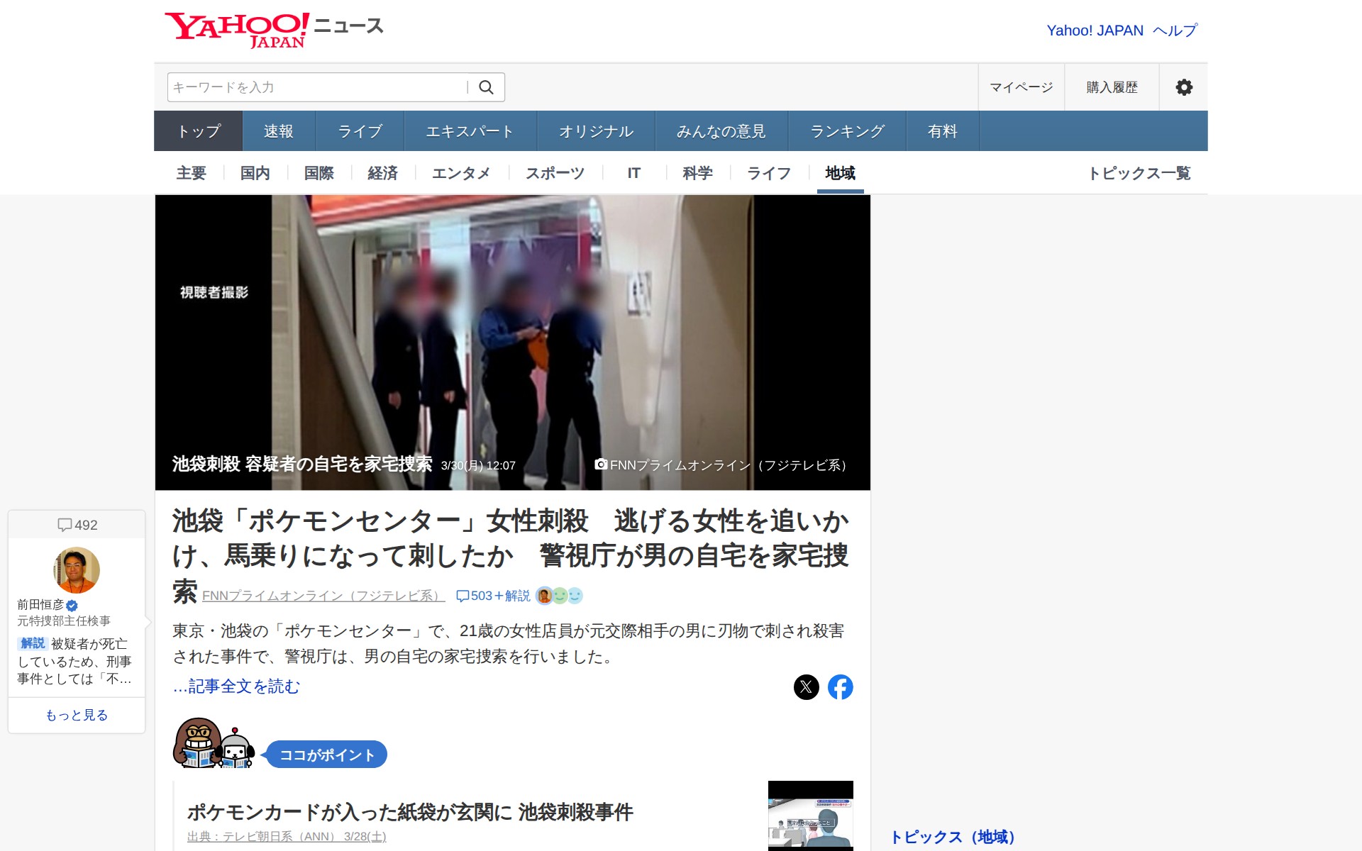 池袋刺殺 容疑者の自宅を家宅捜索 - Yahoo!ニュース - 保存されたスクリーンショット