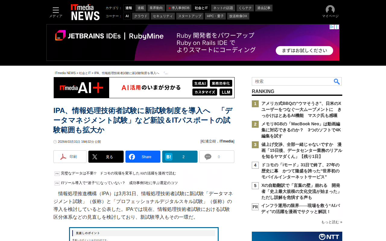 IPA、情報処理技術者試験に新試験制度を導入へ 「データマネジメント試験」など新設&ITパスポートの試験範囲も拡大か - ITmedia NEWS - 保存されたスクリーンショット