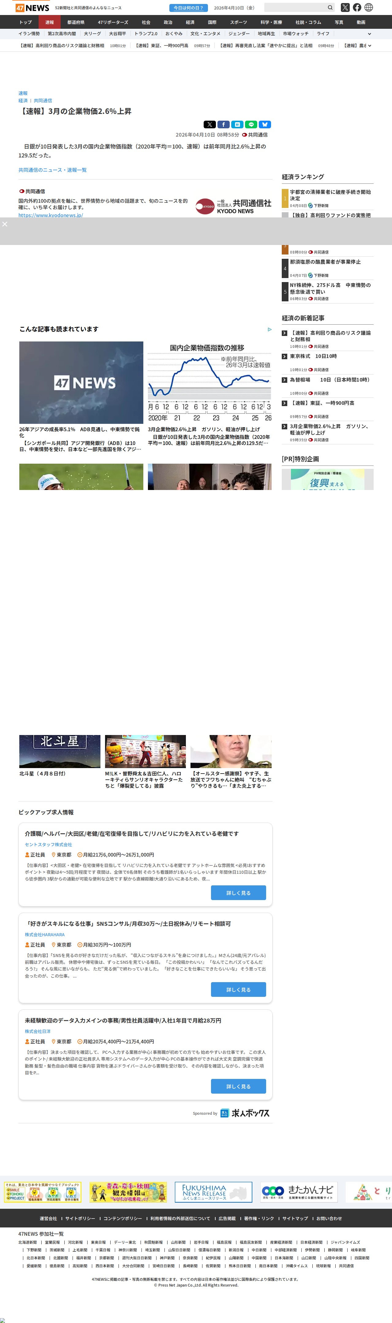 このページは、日本銀行が2026年4月10日に発表した3月の国内企業物価指数に関する速報ニュースです。2020年平均を100とした指数は129.5となり、前年同月比で2.6%上昇しました。記事はガソリンと軽油が物価押し上げの要因であることを示唆しています。47NEWSと共同通信による経済速報として掲載されました。