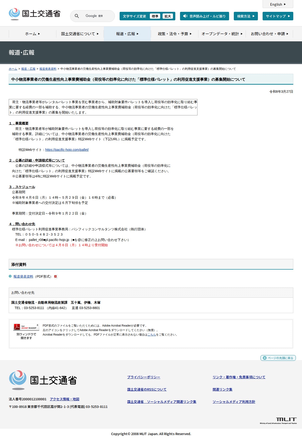 報道発表資料:中小物流事業者の労働生産性向上事業費補助金(荷役等の効率化に向けた「標準仕様パレット」の利用促進支援事業)の募集開始について - 国土交通省