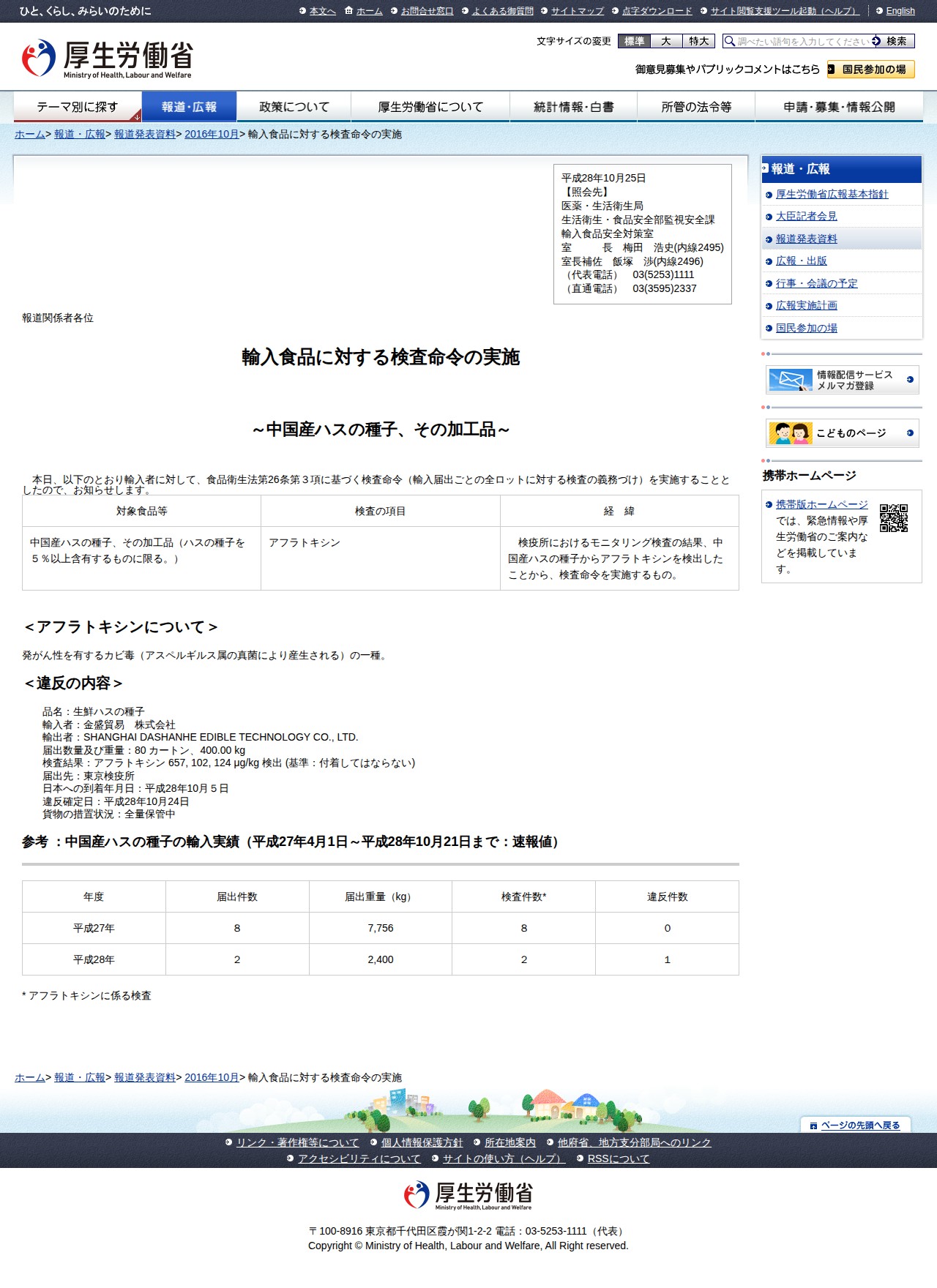 輸入食品に対する検査命令の実施 |報道発表資料|厚生労働省