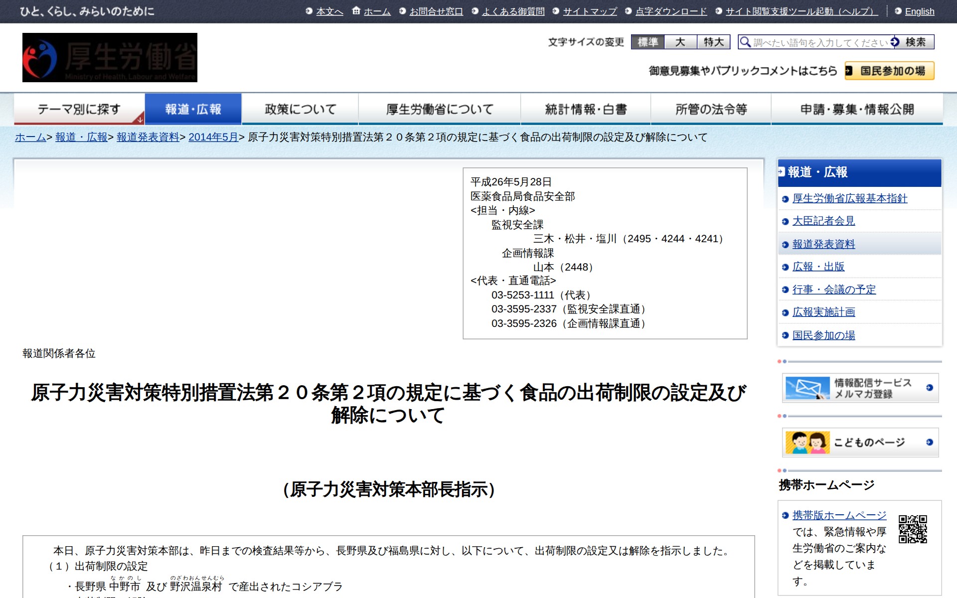原子力災害対策特別措置法第20条第2項の規定に基づく食品の出荷制限の設定及び解除について |報道発表資料|厚生労働省