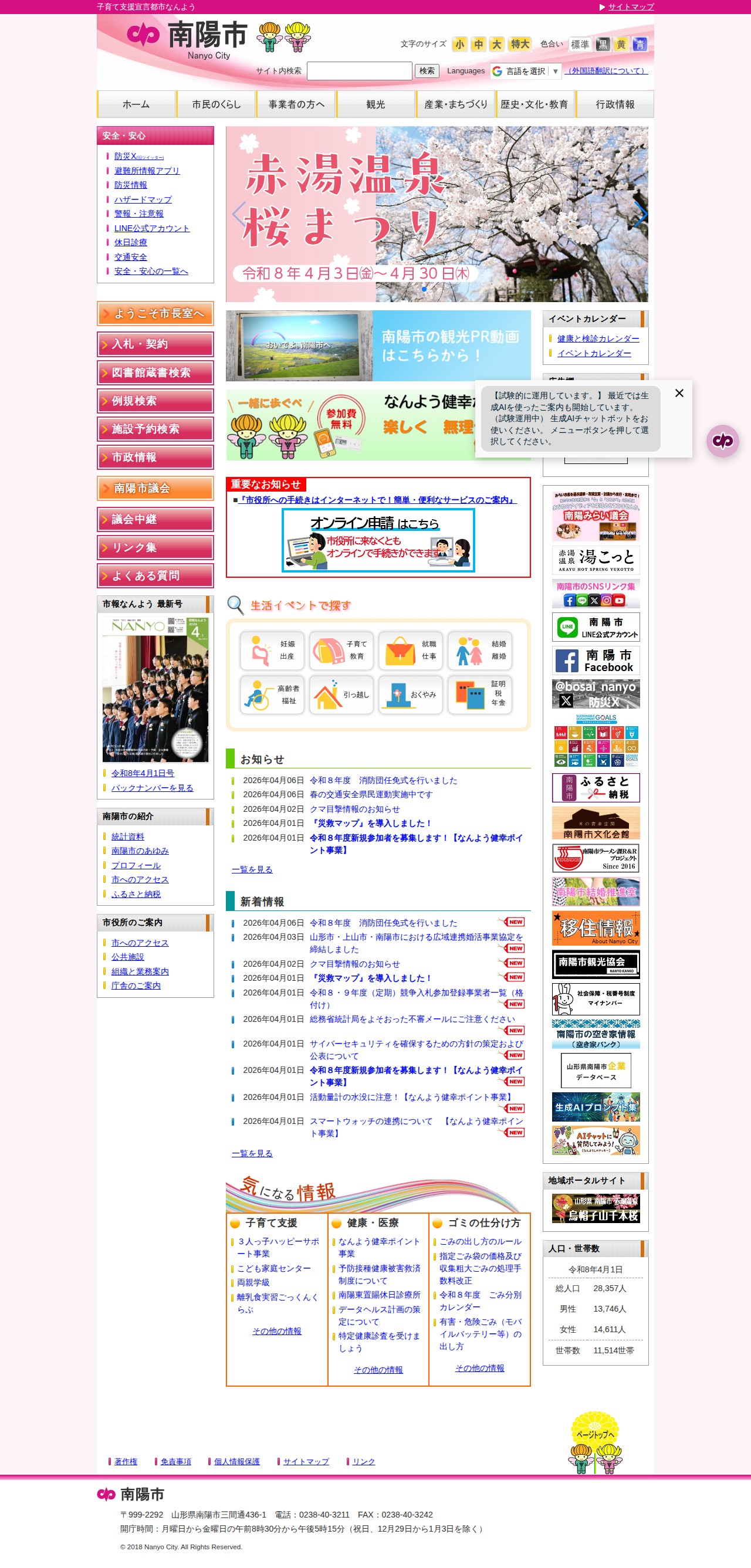 このページは、山形県南陽市の公式ウェブサイトです。「子育て支援宣言都市なんよう」をスローガンに、市民向けの各種情報を提供しています。安全・安心、子育て支援、健康・医療、ごみ分別などの生活に関わる情報が掲載されており、防災情報やハザードマップ、休日診療など緊急時に役立つコンテンツも充実しています。また、市長室への訪問、入札・契約情報、図書館蔵書検索なども利用でき、市政情報や議会中継も確認できます。人口は約28,357人、世帯数は11,514世帯です。