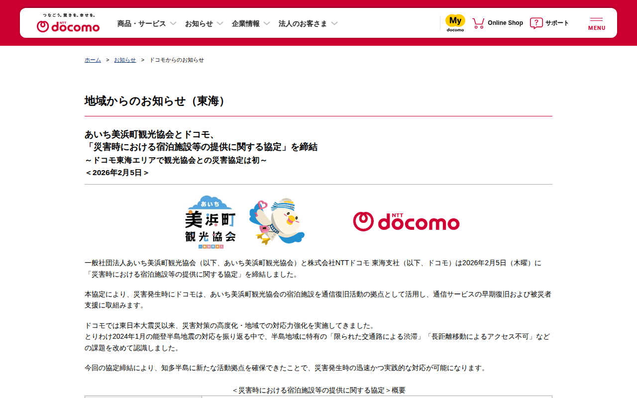 地域からのお知らせ(東海) : あいち美浜町観光協会とドコモ、「災害時における宿泊施設等の提供に関する協定」を締結~ドコモ東海エリアで観光協会との災害協定は初~ | お知らせ | NTTドコモ - 保存されたスクリーンショット