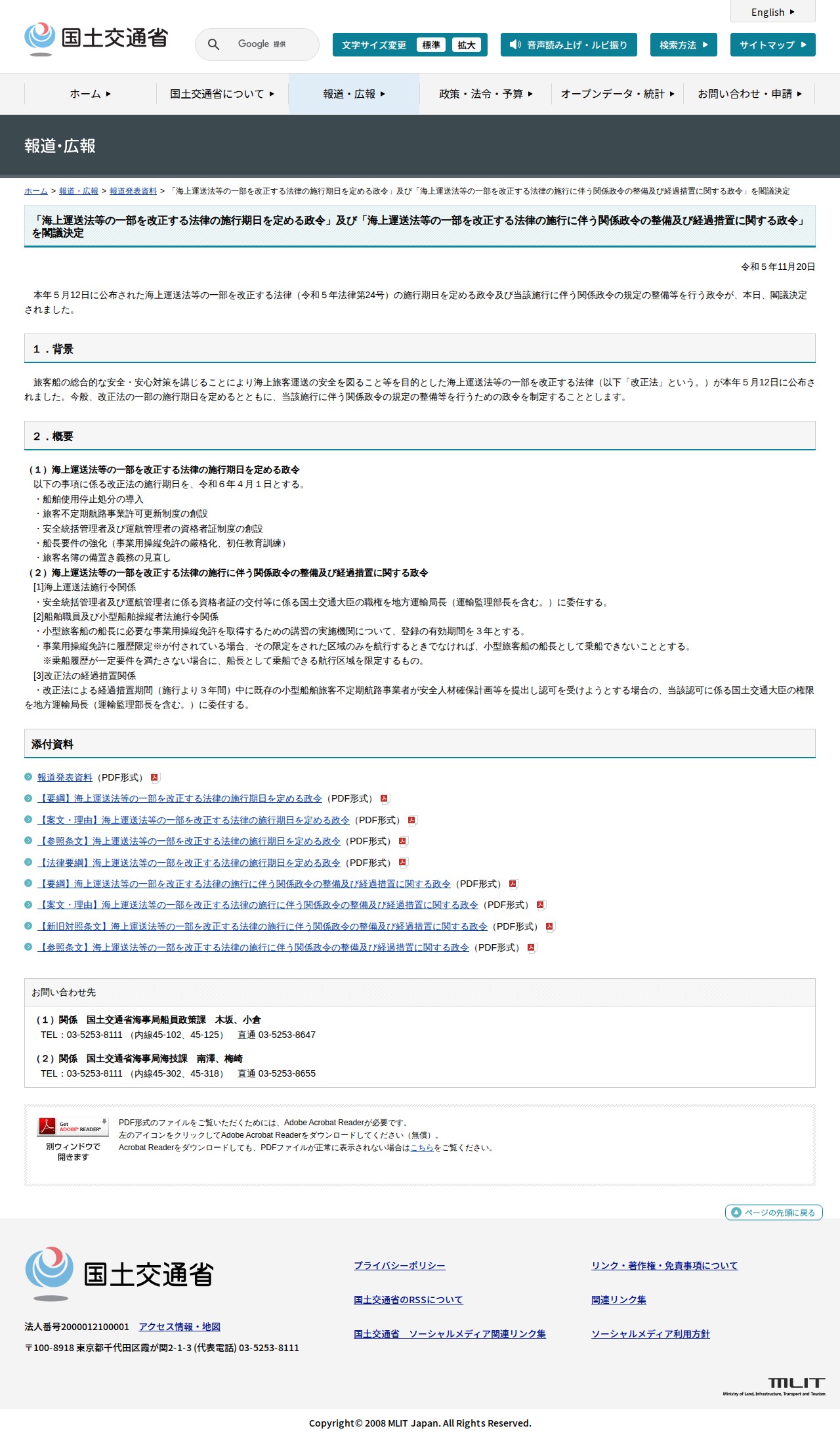 報道発表資料:「海上運送法等の一部を改正する法律の施行期日を定める政令」及び「海上運送法等の一部を改正する法律の施行に伴う関係政令の整備及び経過措置に関する政令」を閣議決定 - 国土交通省 - 保存されたスクリーンショット