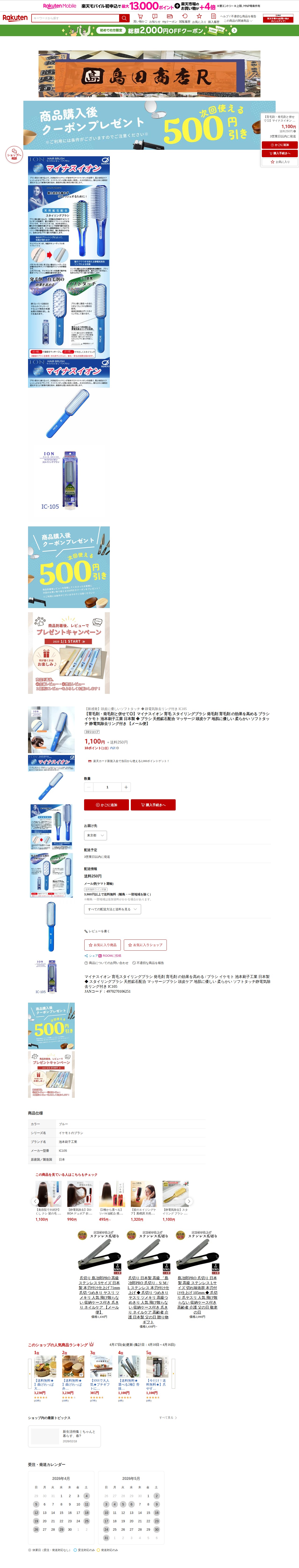 このページは、楽天市場で販売されているマイナスイオン育毛スタイリングブラシの商品情報を掲載しています。イケモト池本刷子工業製の日本製ブラシで、天然鉱石配合、静電気除去リング付きです。頭皮に優しいソフトタッチで、育毛剤・発毛剤と併用することでその効果を高めます。価格は1,100円で、メール便で送料250円(3,980円以上で送料無料)、3営業日以内に発送予定です。