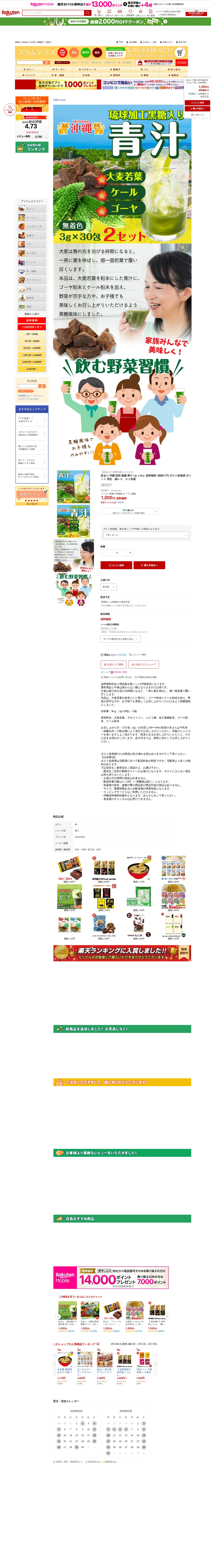 このページは、楽天市場で販売されている沖縄産の黒糖青汁商品の紹介ページです。大麦若葉にゴーヤとケール粉末を加え、黒糖風味にした青汁で、3g×60包、送料無料で1,000円です。訳あり商品のため簡易包装(PP袋発送)となっており、ポスト投函便での配送となります。大麦若葉の栄養価と飲みやすさが特徴で、お子様にも適しています。水や牛乳に溶かして召し上がることが推奨されています。