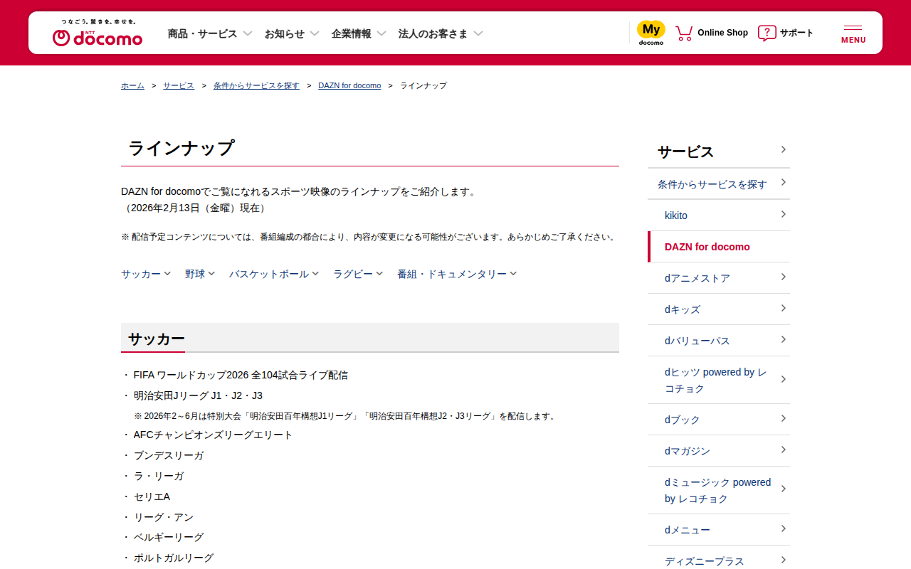 https://www.docomo.ne.jp/service/dazn/lineup.html?icid=CRP_SER_dazn_to_CRP_SER_dazn_lineup&d=4&p=42026年4月12日 10:36 JST•アーカイブページ・viewer・ダウンロードは、この保存版を基準に表示されます。