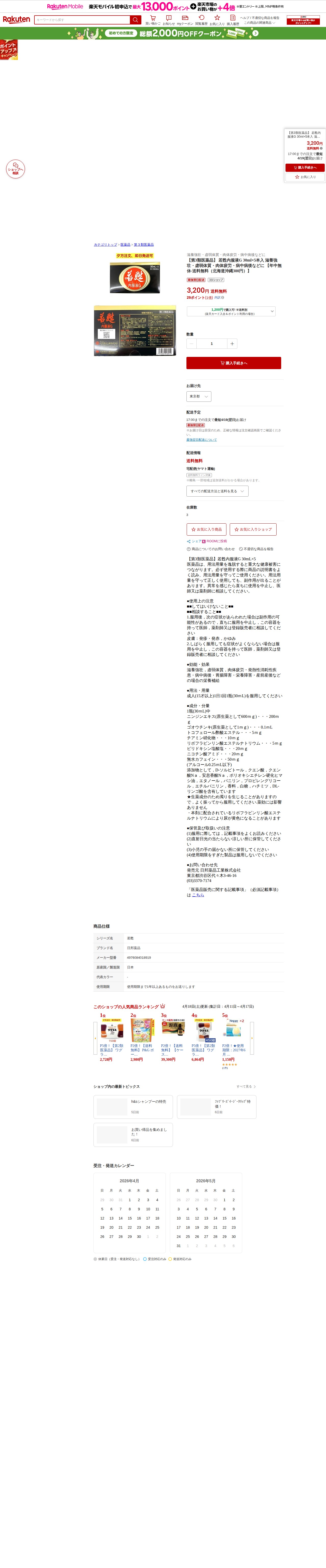 このページは、楽天市場で販売されている「若甦内服液G 30ml×5本入」という第3類医薬品の商品ページです。滋養強壮、虚弱体質、肉体疲労、病中病後などの栄養補給に用いられます。価格は3,200円で送料無料(北海道沖縄は300円)。成人は1日1回1瓶を服用し、ニンジンエキス、ビタミンB群、カフェインなどを含有しています。17時までの注文で翌日配送可能で、在庫は3本です。医薬品のため用法用量を守り、副作用が出た場合は使用を中止して医師に相談する必要があります。