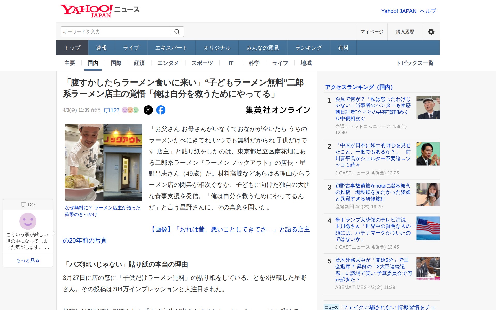 「腹すかしたらラーメン食いに来い」“子どもラーメン無料”二郎系ラーメン店主の覚悟「俺は自分を救うためにやってる」(集英社オンライン) - Yahoo!ニュース